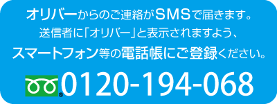 オリバーからのご案内をSMSで受信した際に送信者に「オリバー」と表示されますよう、下記のフリーダイヤルをお客様のスマートフォン等の電話帳や連絡先に「オリバー」の名前でご登録ください。